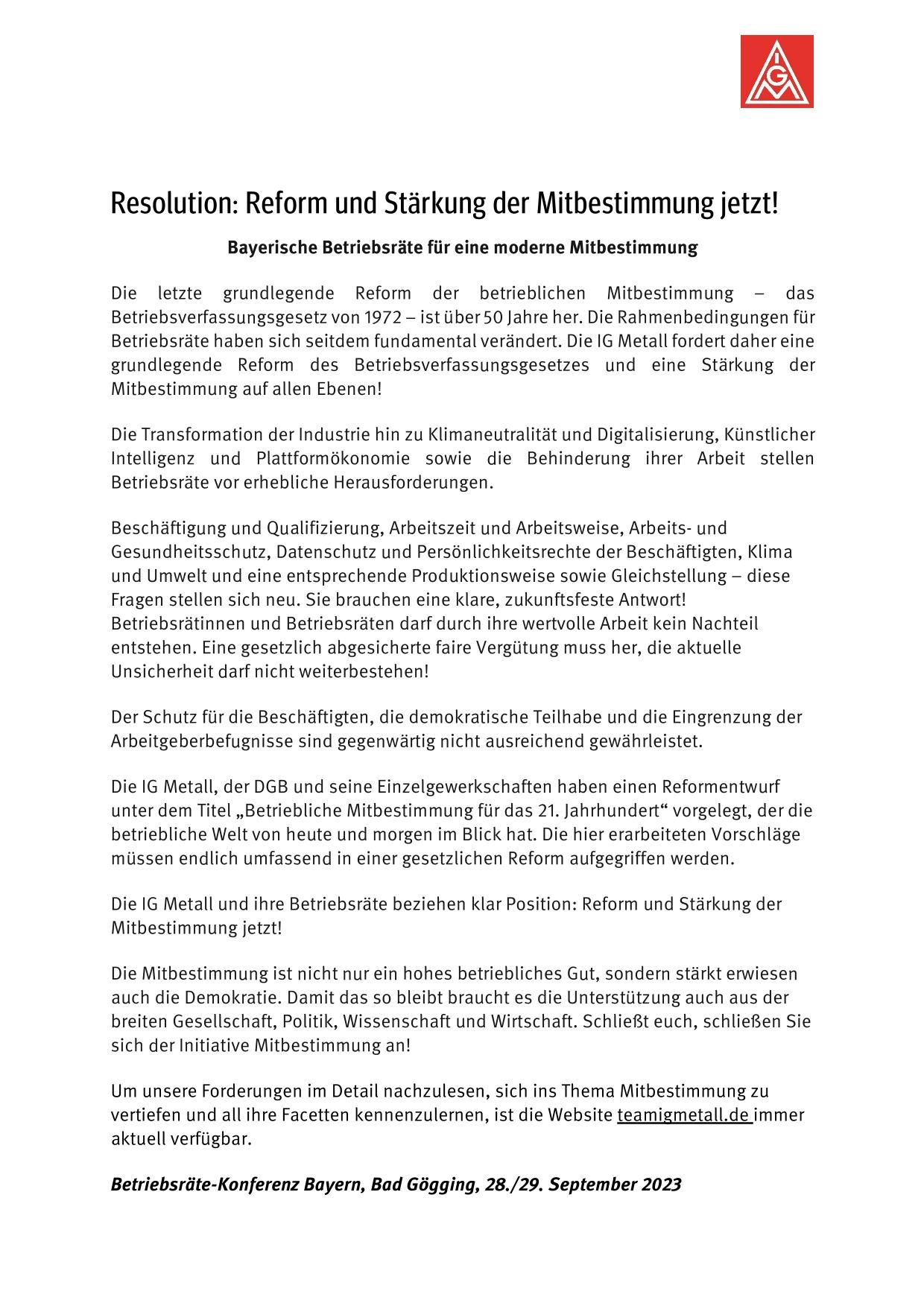 Rund 120 bayerische Betriebsräte haben heute bei einer Betriebsräte-Konferenz der IG Metall in Bad Gögging eine Resolution zur Stärkung und Reform der Mitbestimmung beschlossen. Ziel ist, die betriebliche Mitbestimmung für die Arbeitswelt der Zukunft fit zu machen und die wichtige Arbeit von Betriebsräten besser zu unterstützen. Dazu haben IG Metall und DGB auch einen konkreten Gesetzesvorschlag vorgelegt.